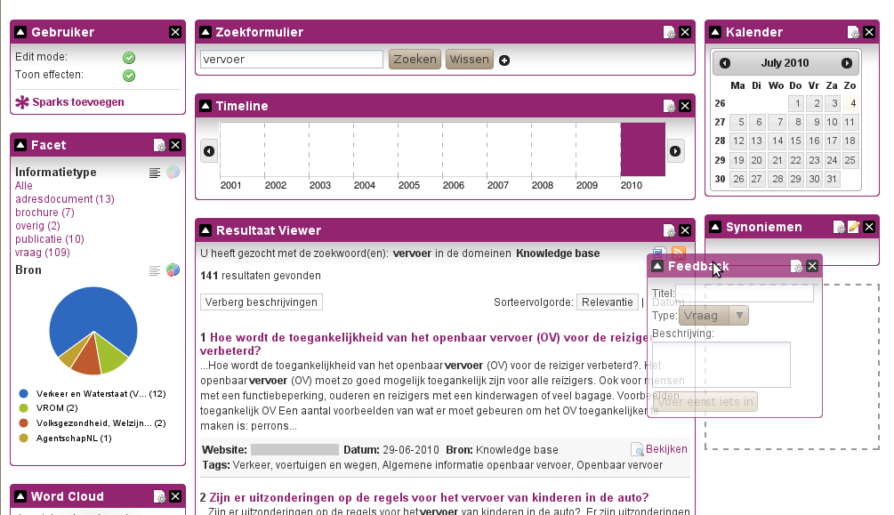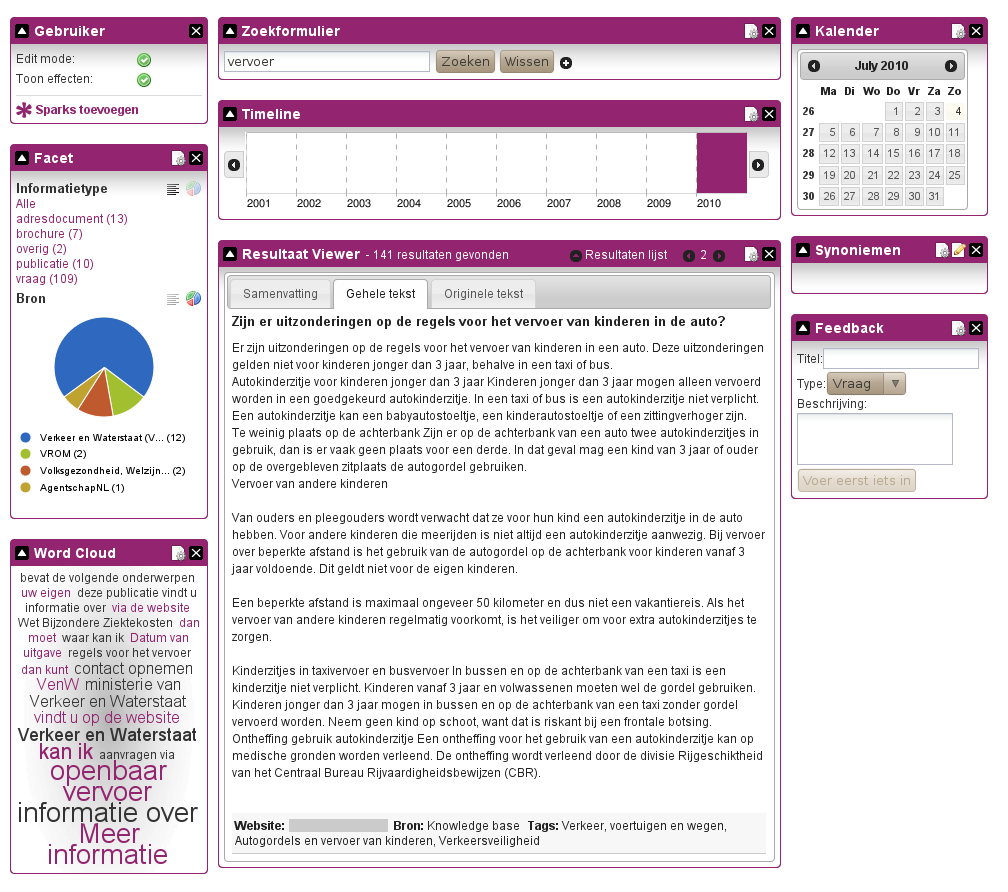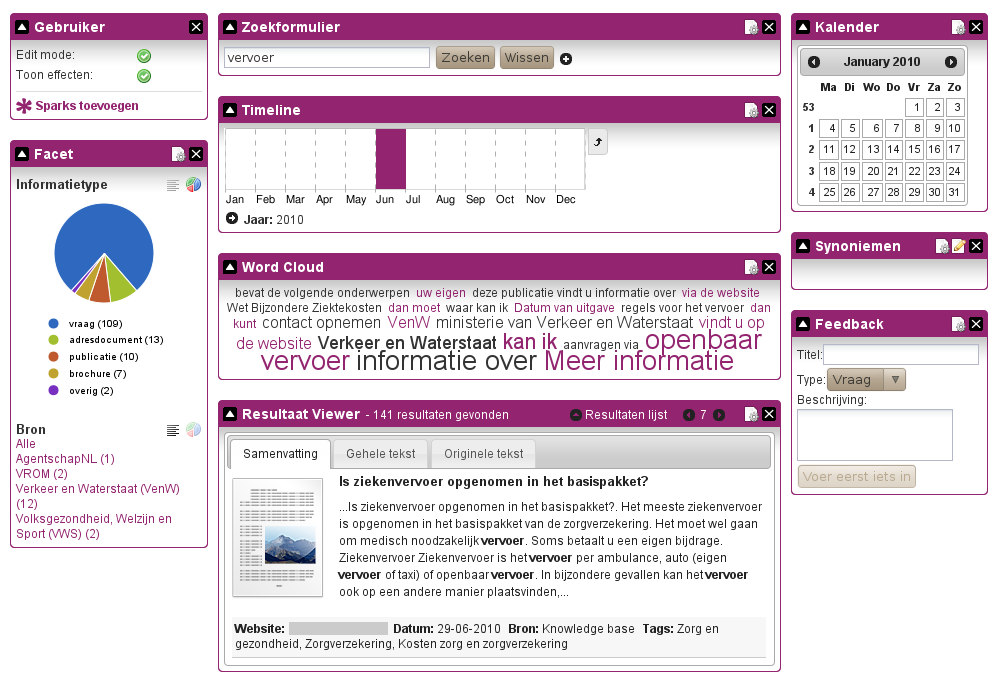 Met dit project hebben we widgets en een widget framework ontwikkeld voor het verkrijgen van kant en klare stukjes interactieve elementen die ingezet kunnen worden bij het bouwen van een enterprise zoekapplicatie. Deze widgets kunnen op eenvoudige wijze worden geïntegreed met content management systemen zoals Tridion, open source CMS en portals (Drupal, Joomla, LifeRay) en verschillende standaard of maatwerk webapplicaties en systemen (.NET, ASP, PHP, JSP, etc.). Gebruikte technieken: PHP5, Drupal, XML, XSLT, XHTML, CSS, Javascript, jQuery, jQuery UI, iNettuts, AJAX, Subversion, cURL, REST, PDO, SQLite en performance optimalisatie.