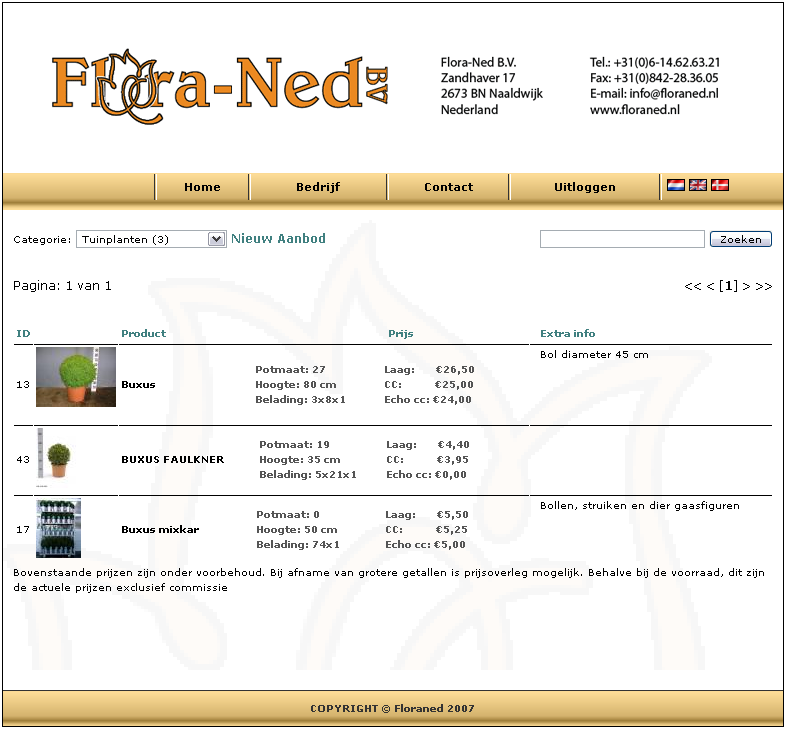 Flora-Ned B.V. is vooral gespecialiseerd in de exclusieve planten, zoals bijvoorbeeld speciale Phalaenopsis soorten en andere Orchideeën. Daarnaast verkopen zij ook alle gangbare planten. Dit kan via de klokken in zowel Naaldwijk als Aalsmeer, maar uiteraard ook direct van de kweker of via de bemiddelingsbureau’s.